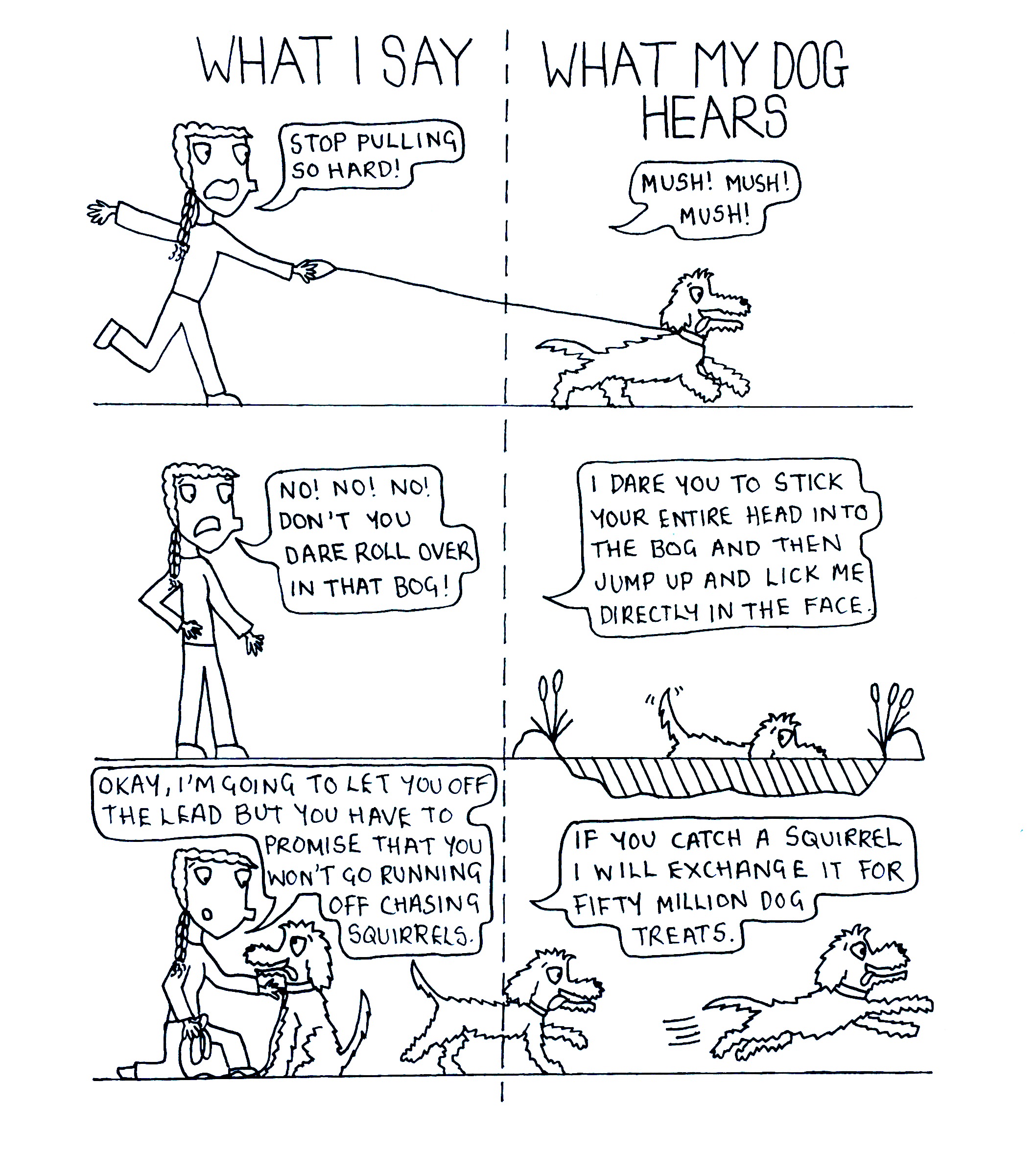 3. This is really funny and very accurate – my dog (a rescue dog who is part whippet and part NotAClue) shares a zero success rate against squirrels. She is also convinced that the best way to show her affection is to run towards me, climb up my chest and rake my body open until she can see my heart beating with love inside my chest. The drawings are great!