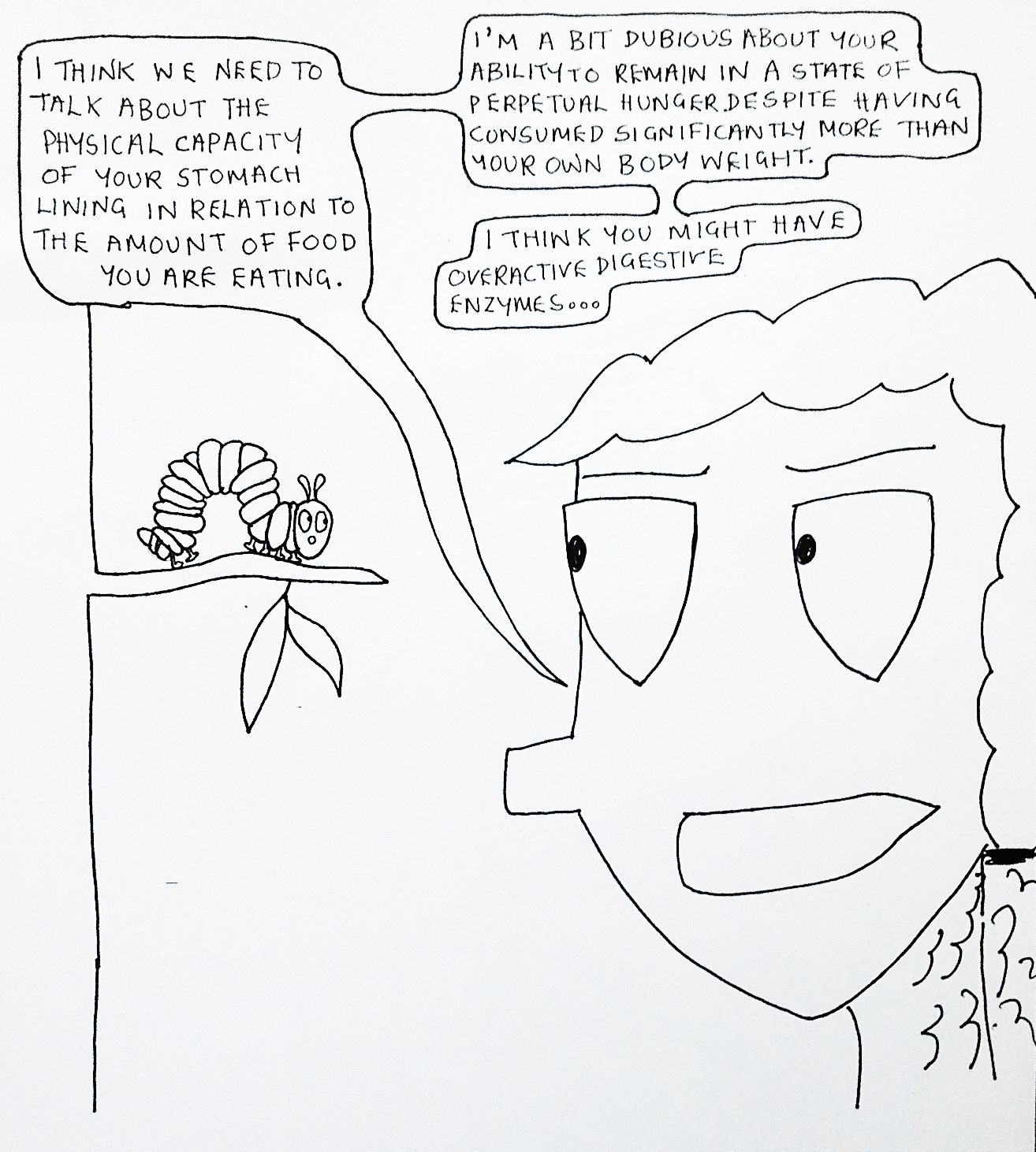 However, as I have grown older and my knowledge of the anatomy of insects has developed, it has become harder for me to get invested in narratives such as The Very Hungry Caterpillar.